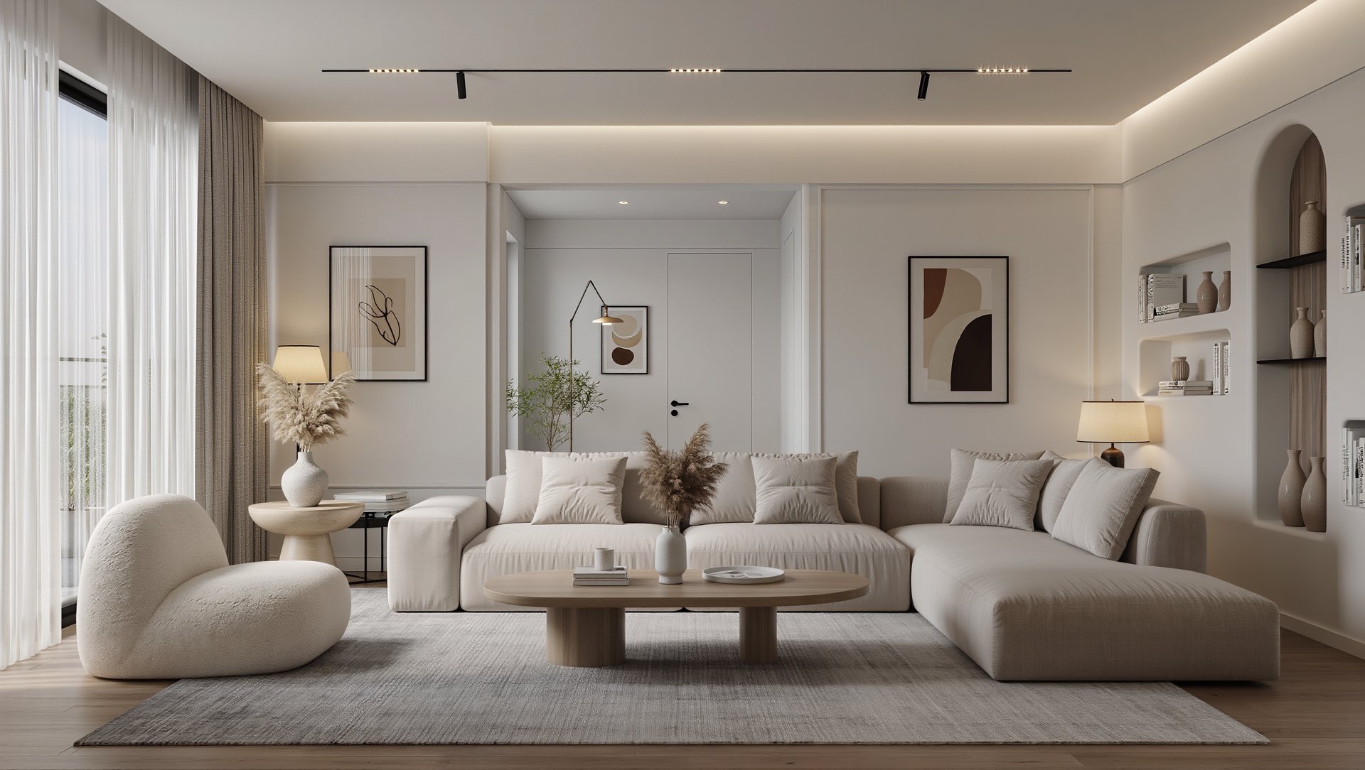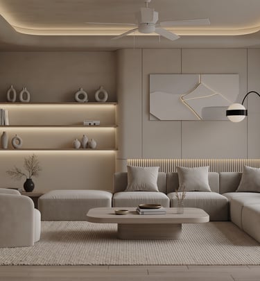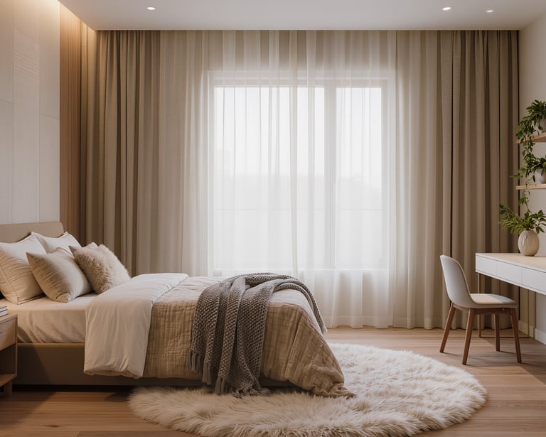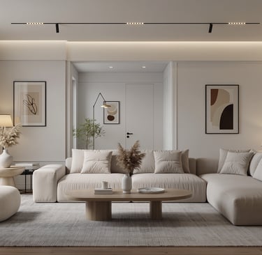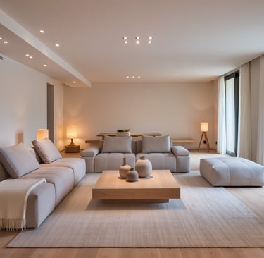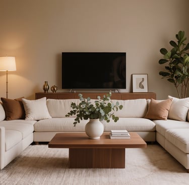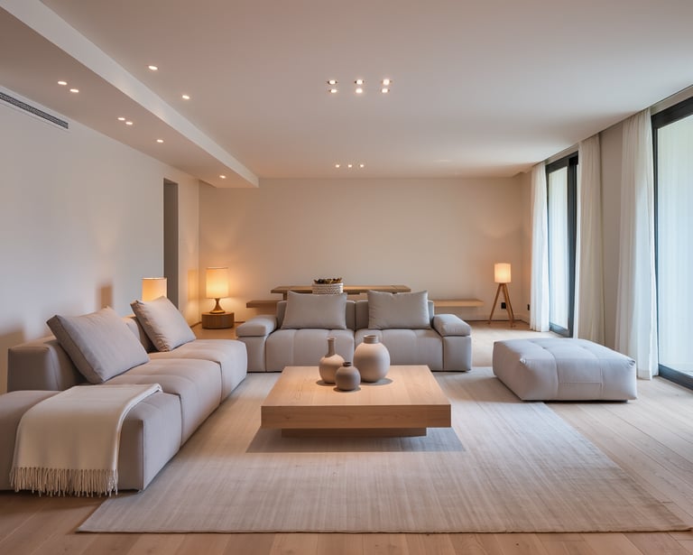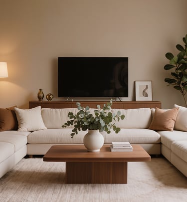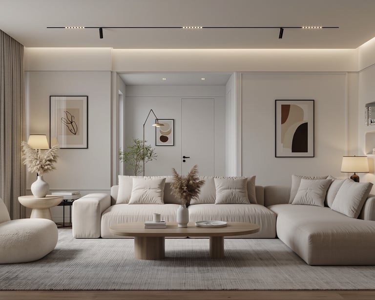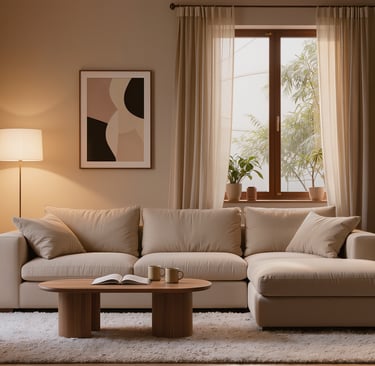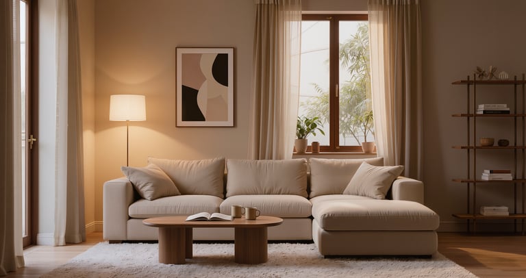 Cozy modern living room with soft textures and warm atmosphere.