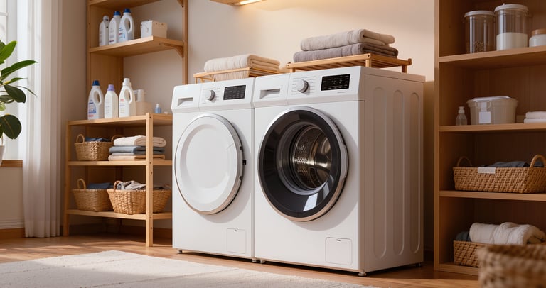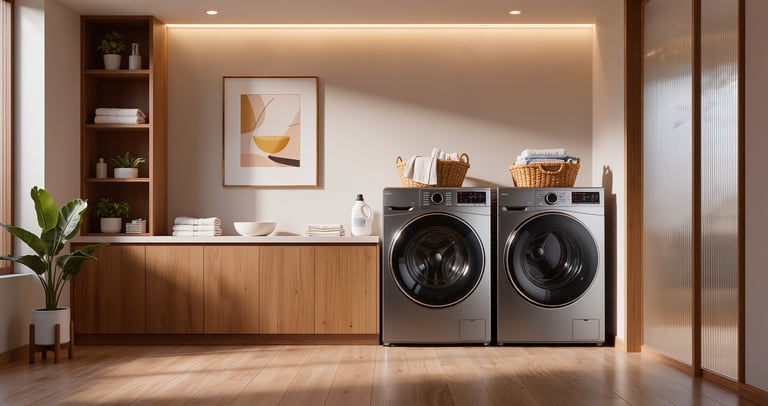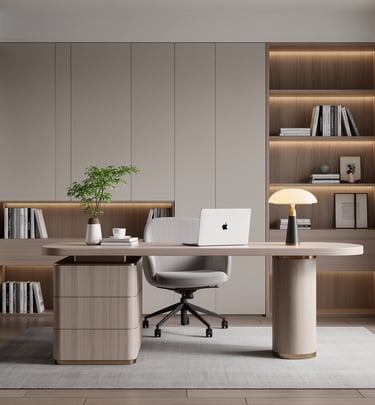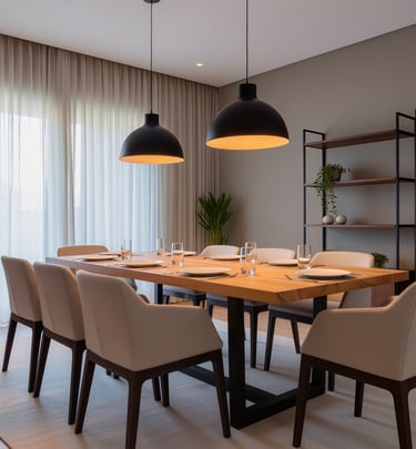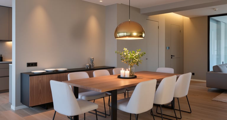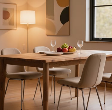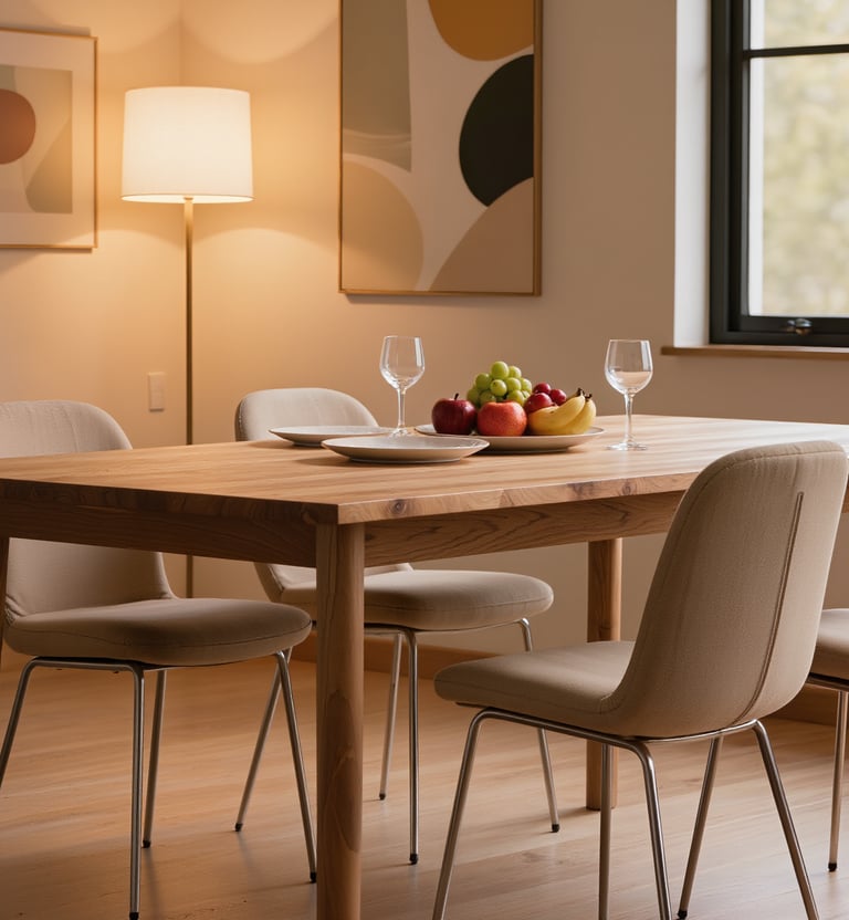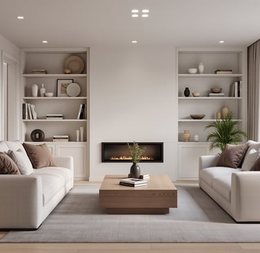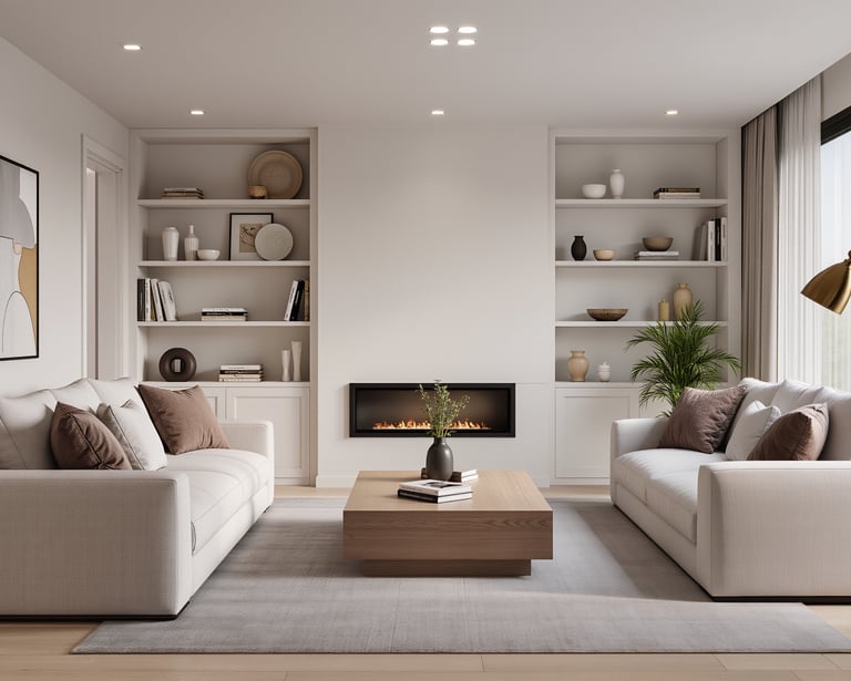 Cozy modern living room with soft textures and warm atmosphere.
