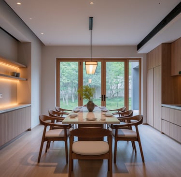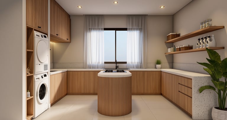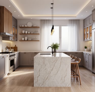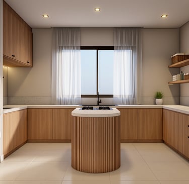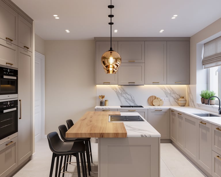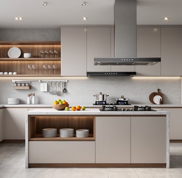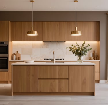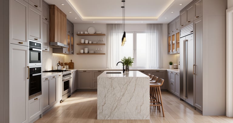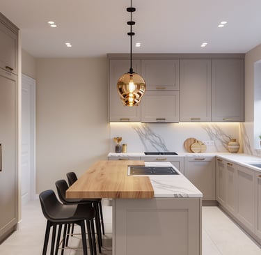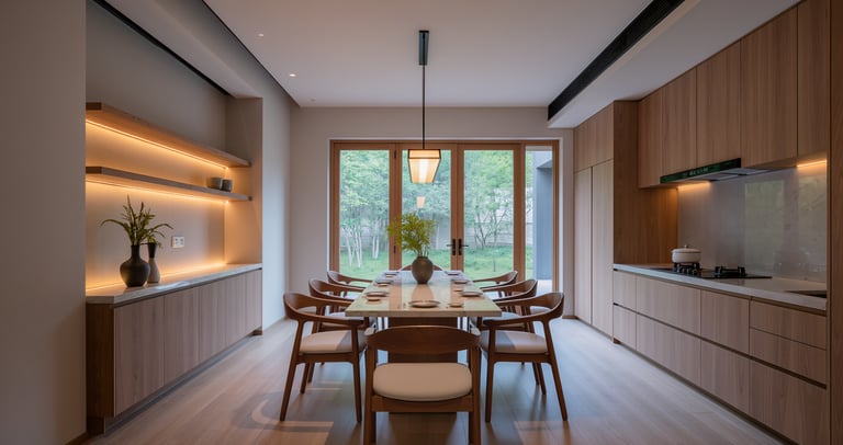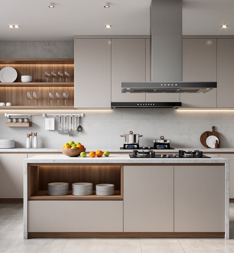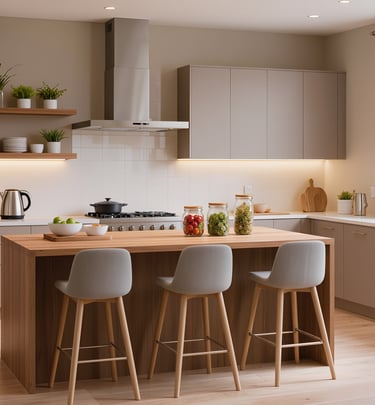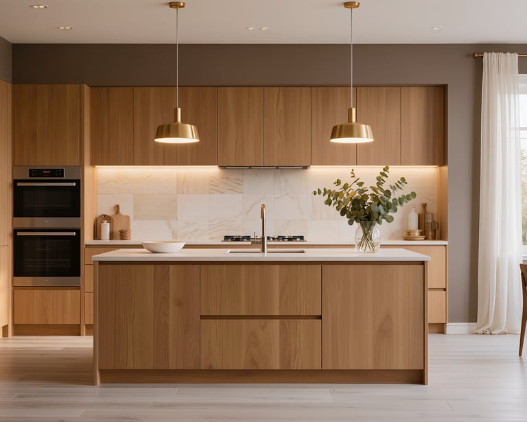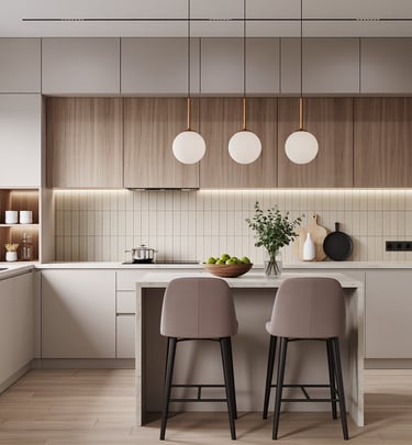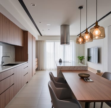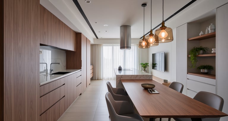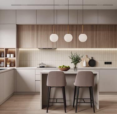 Cozy modern kitchen with wide view and warm ambient lighting.