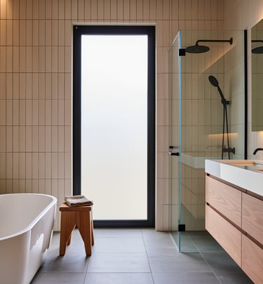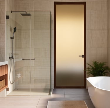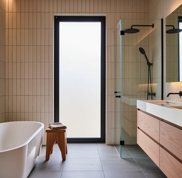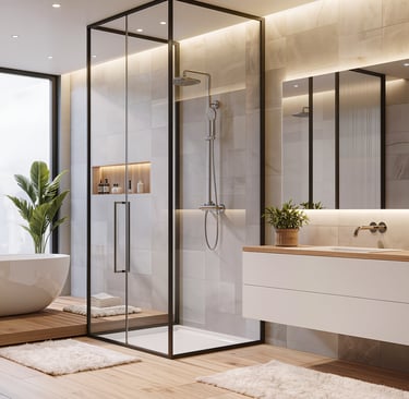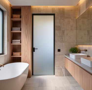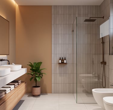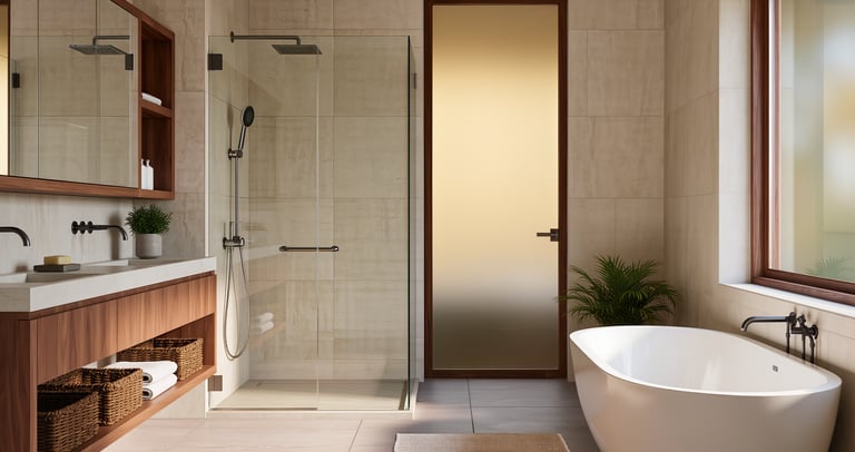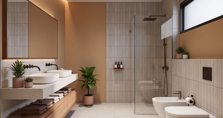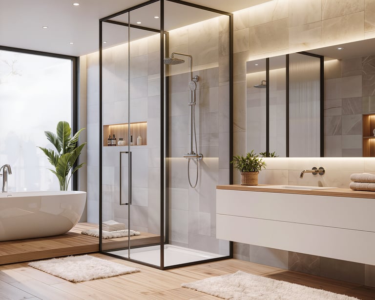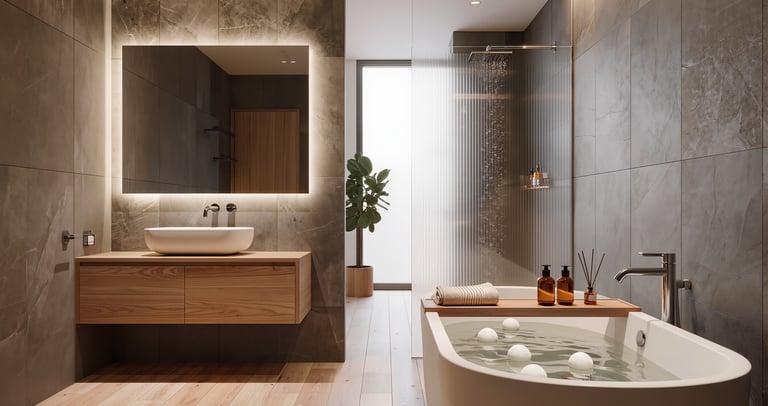 Cozy modern bathroom with warm lighting and spa-like atmosphere.