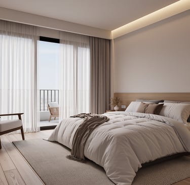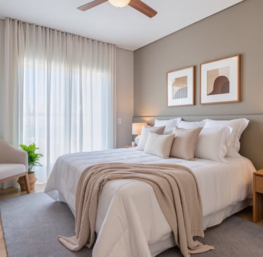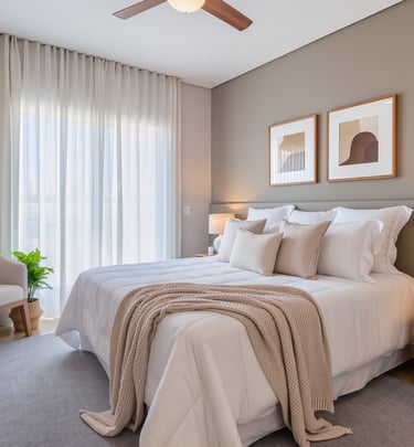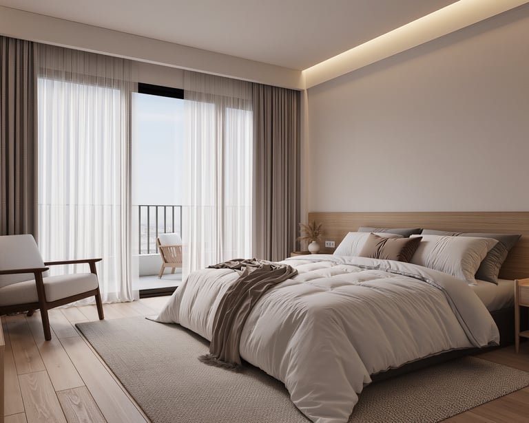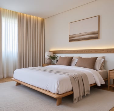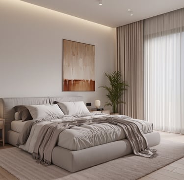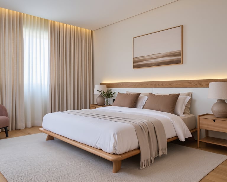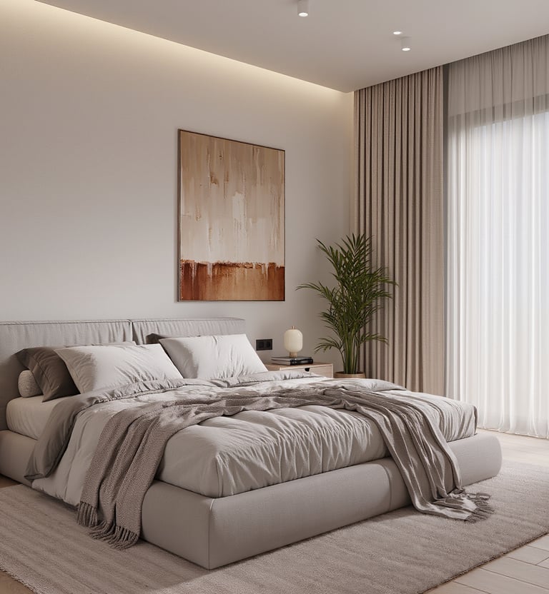 Cozy modern bedroom with warm lighting and neutral tones.