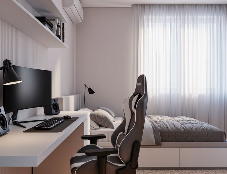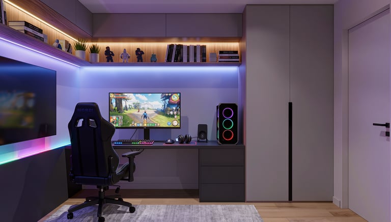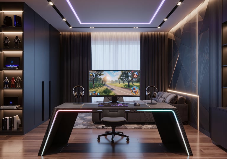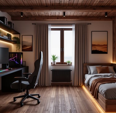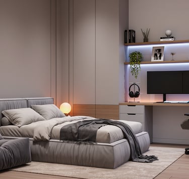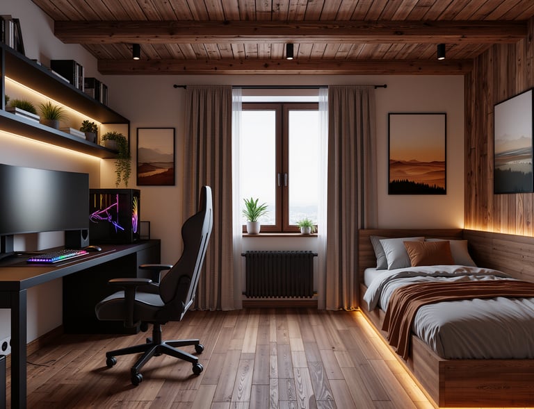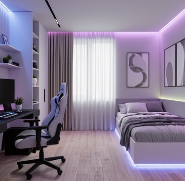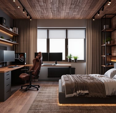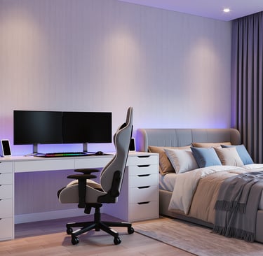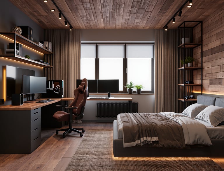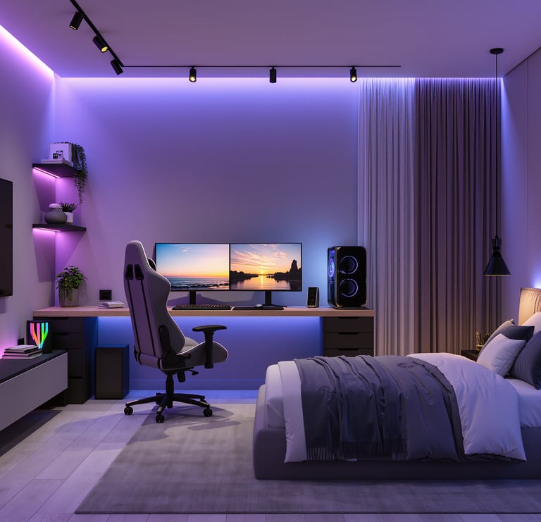 Modern bedrooms blending sleek setups with cozy, ambient lighting