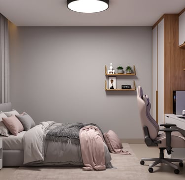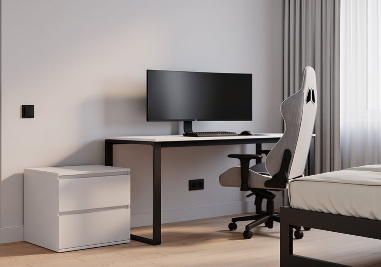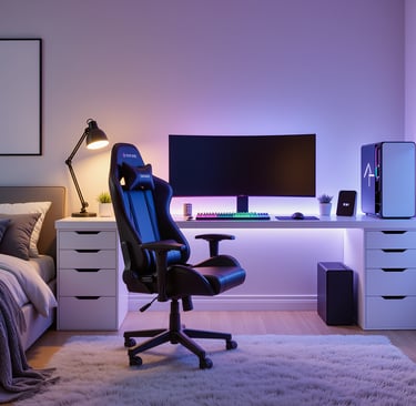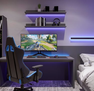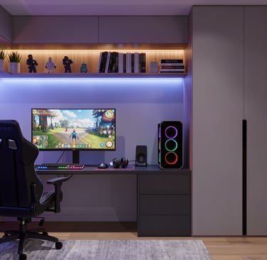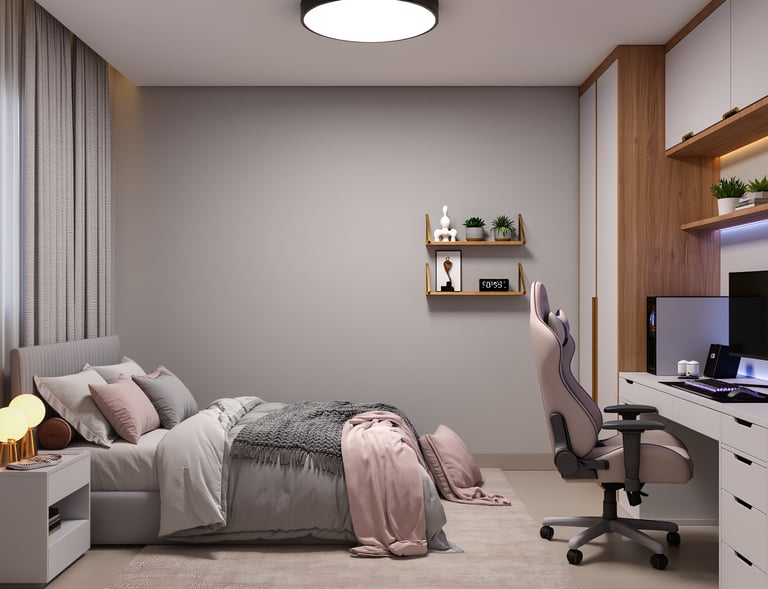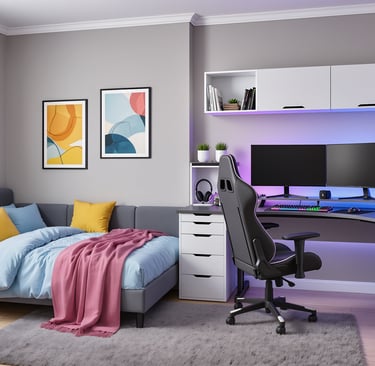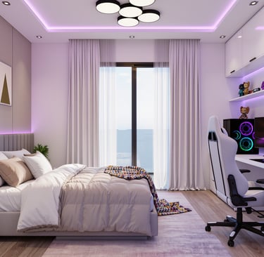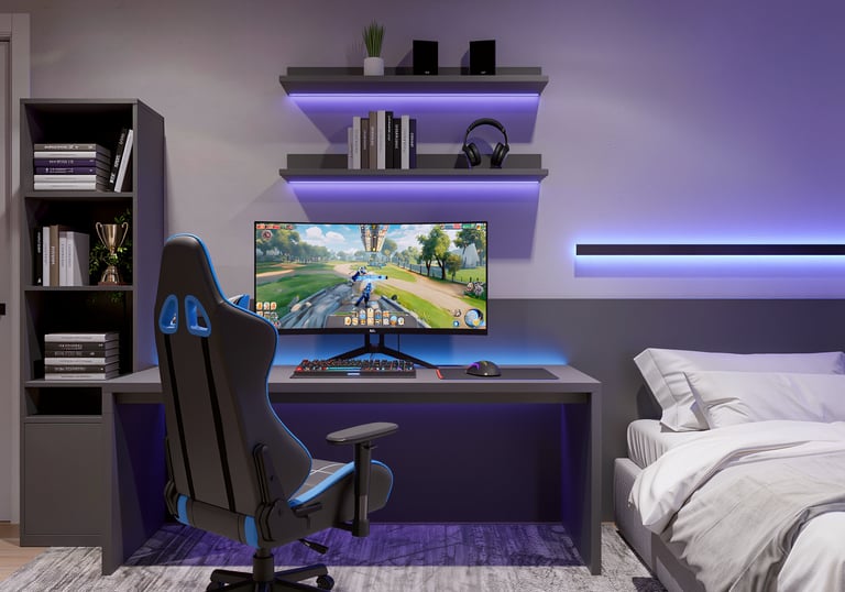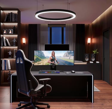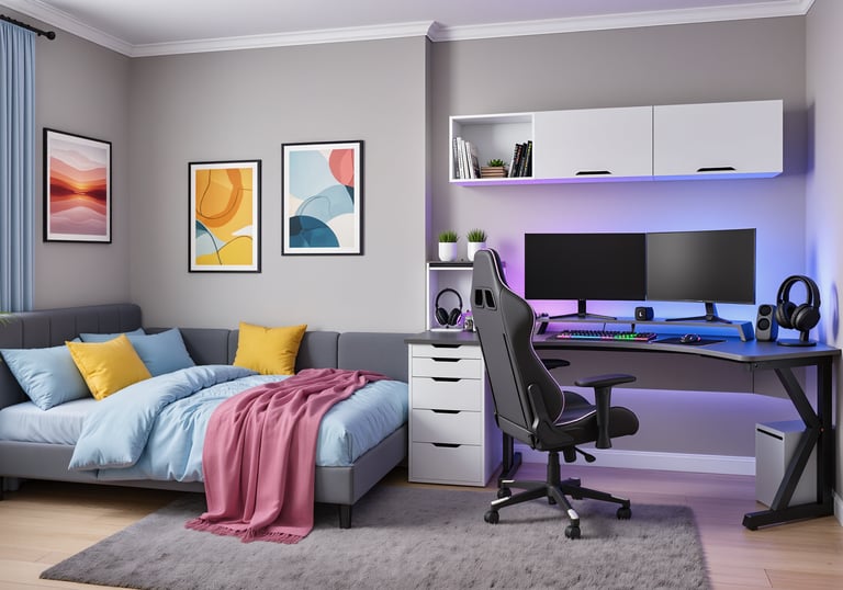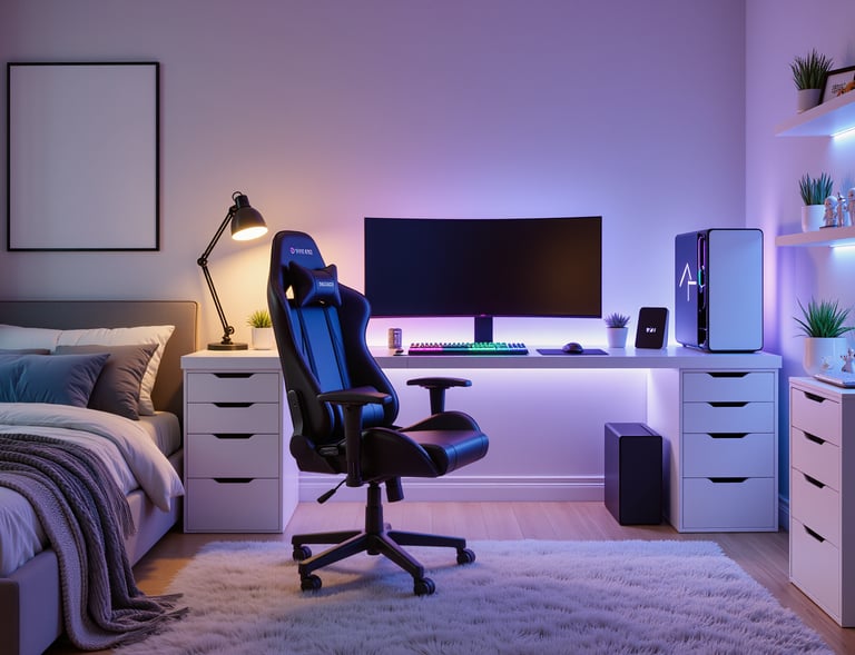 Modern bedrooms blending sleek setups with cozy, ambient lighting